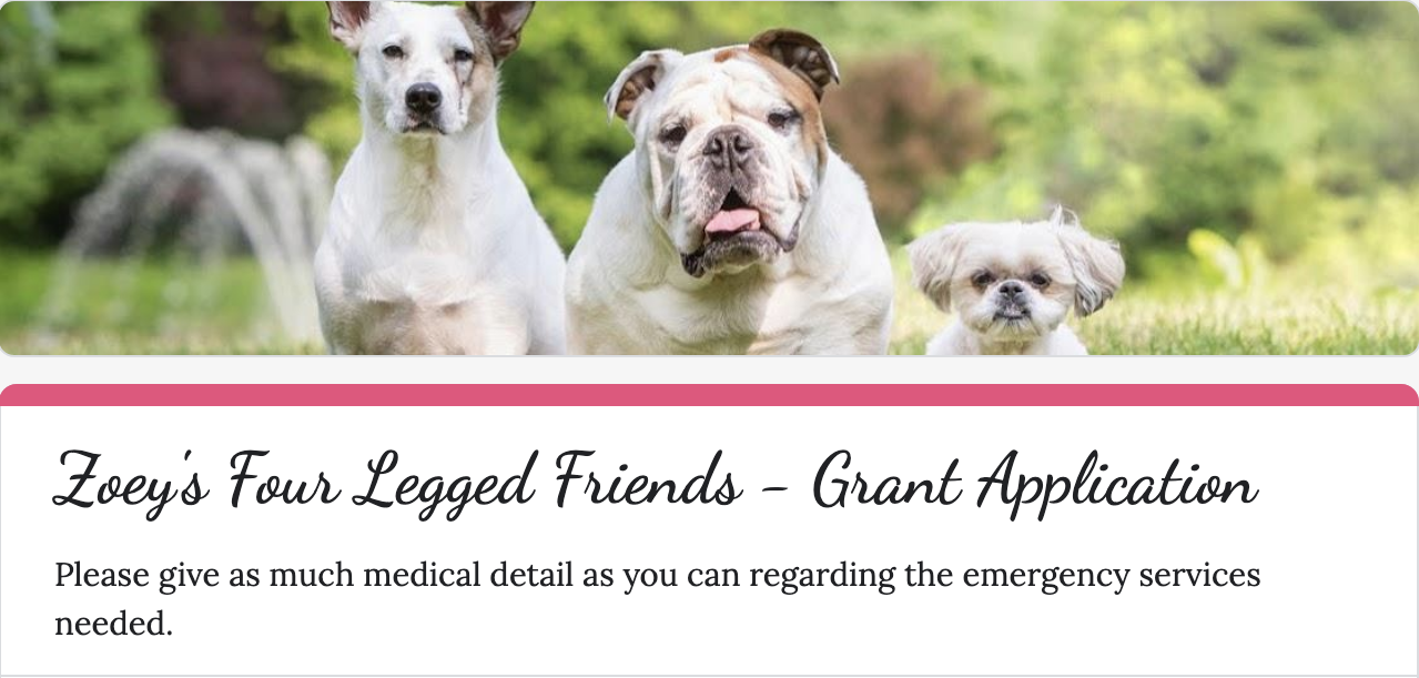 Please fill out the form below completely. Once the application is submitted, you will receive a confirmation that it has been submitted within 24 hours. If you do not receive a confirmation in the allotted time or have any questions on the application, please email us at zoeysfourleggedfriends@gmail.com. This Grant only applies to Emergency vet care that will save the pet from Euthanasia. There is only a one-time Grant per pet in the household allowed.
